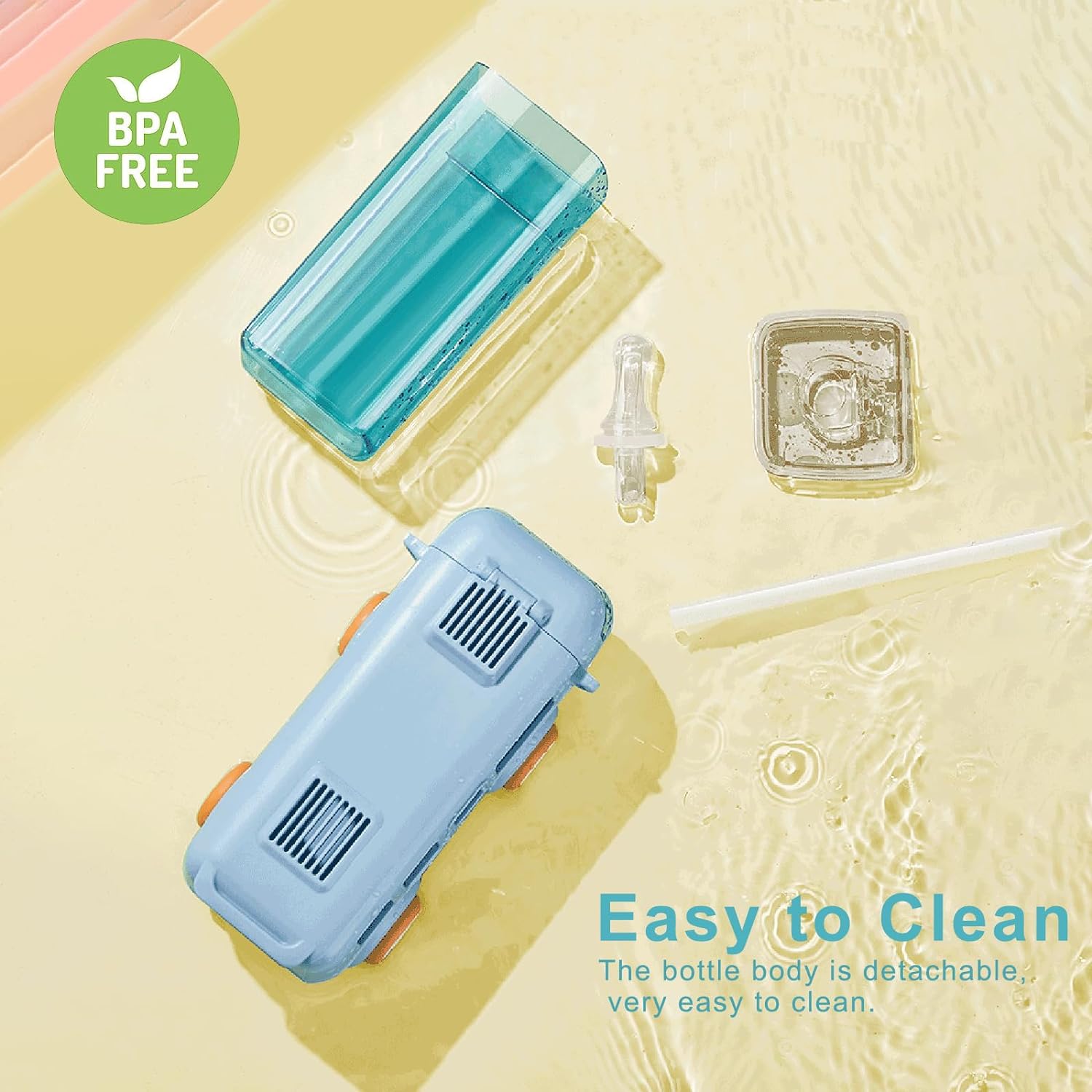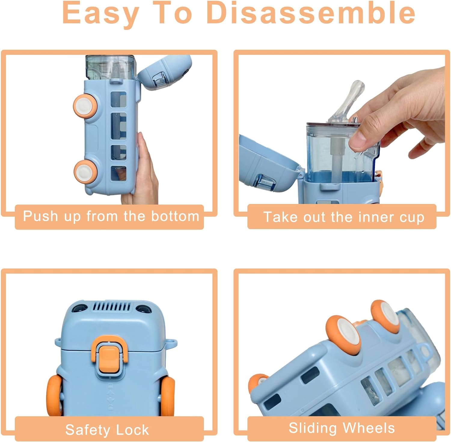 Unique Design: Crafted in the shape of a cute cartoon car, this water bottle is both playful and practical. The movable wheels at the bottom add an extra element of fun, making it not just a drink container but also a toy that kids will love to carry around.