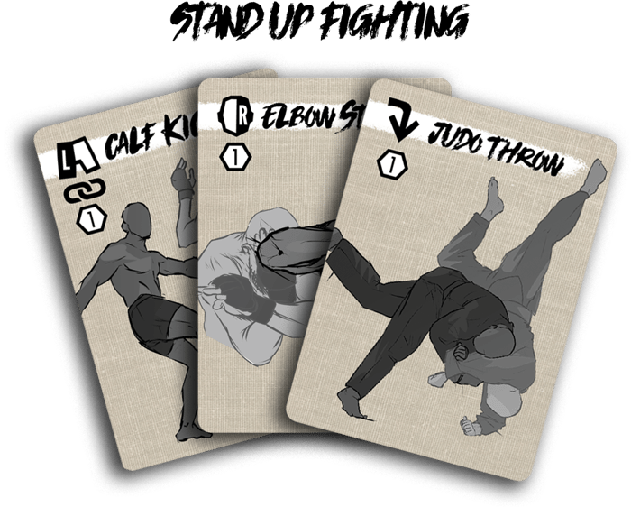 Stand up fighting will see both players positioning themselves around the cage, exchanging strikes, attempting slams, and using their skills to gain the advantage over their opponents. Each player draws a hand of cards featuring a variety of strikes targeting locations of the body, as well as takedown cards should they want to change things up. Players draw from the same deck and must try to figure out the weaknesses of their opponents and decide when to drain their hand of cards, or hold back for more defensive options.