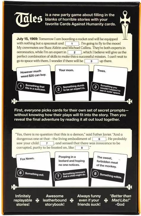 Humor Meets Creativity: While other games focus on straightforward storytelling, Tales adds the signature Cards Against Humanity twist – dark, edgy, and laugh-out-loud funny.