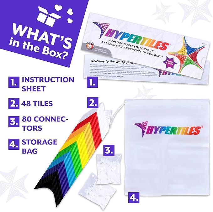 🧠Infinite Shape Possibilities: 48 three-dimensional tiles and 80 connectors give you infinite possibilities to build smaller or larger structures! Your little scientists can connect tiles together to shape static and dynamic shapes that move and bend. Encourage your curiosity, unleash their creative potential and discover the beauty of building small or large geometric shapes with HyperTiles.