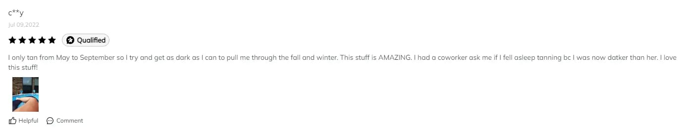 “ I was able to obtain and overall long last glowing tan. Love it and will again for my next vaca.” ————— Dana Alex 2022.10.13