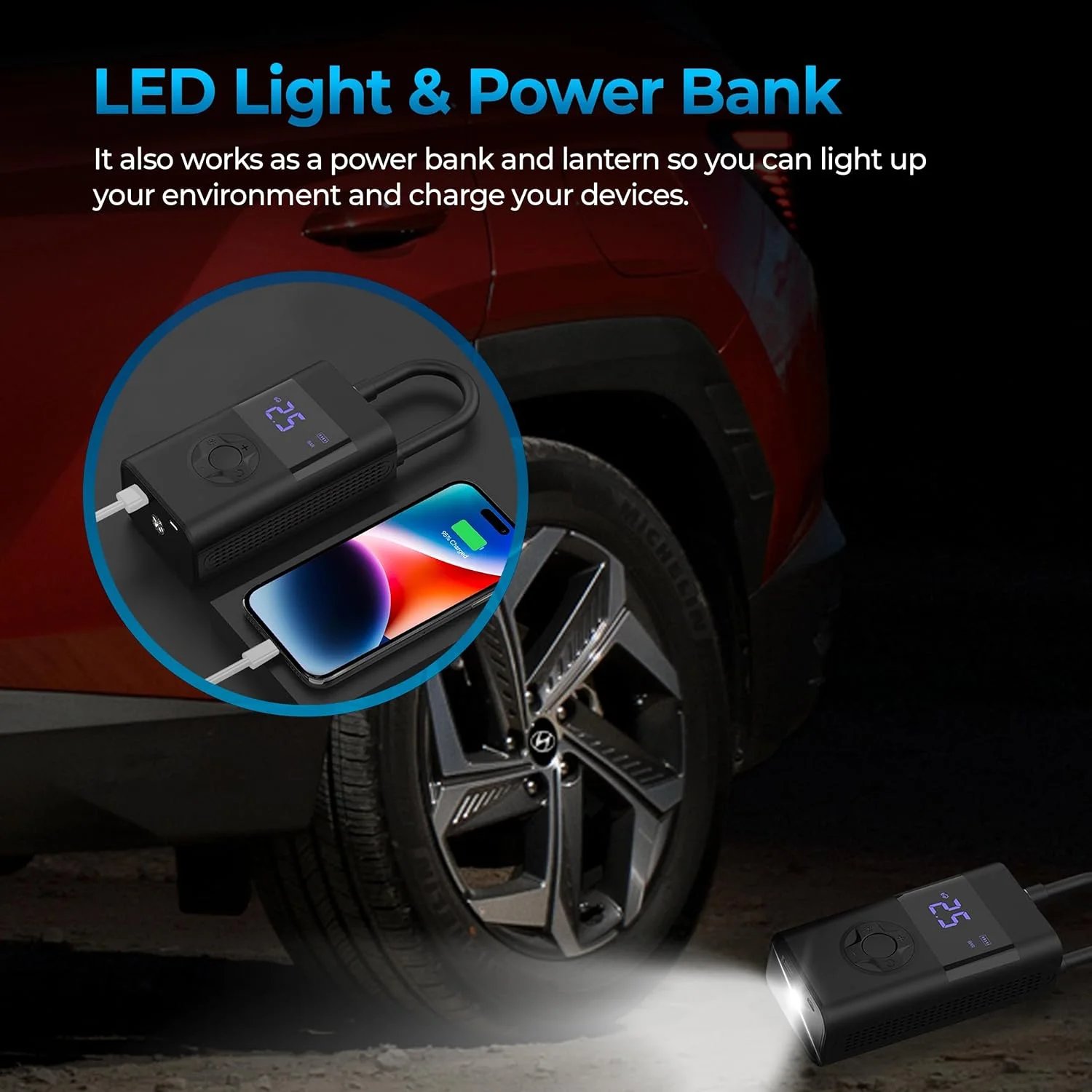 With a built-in super bright LED light, it can provide you with convenience for emergency lighting, bringing you a bright field of view so that you won’t have to worry about replacing parts in dark places while traveling. It can also be used as a power bank to charge your Android or IOS devices via USB.