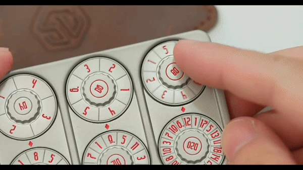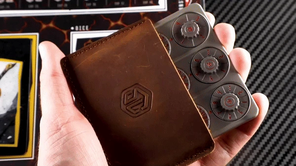 features a card-shaped design, matching the size of a standard credit card and measuring just 5mm thick. It consists of six spinning wheels for d4, d6, d8, d10/00, d12, and d20, each embedded with micro ball bearings to ensure a smooth and long-lasting spin. At the center of each wheel, precision markers clearly indicate the result, making it easy to use in any setting.