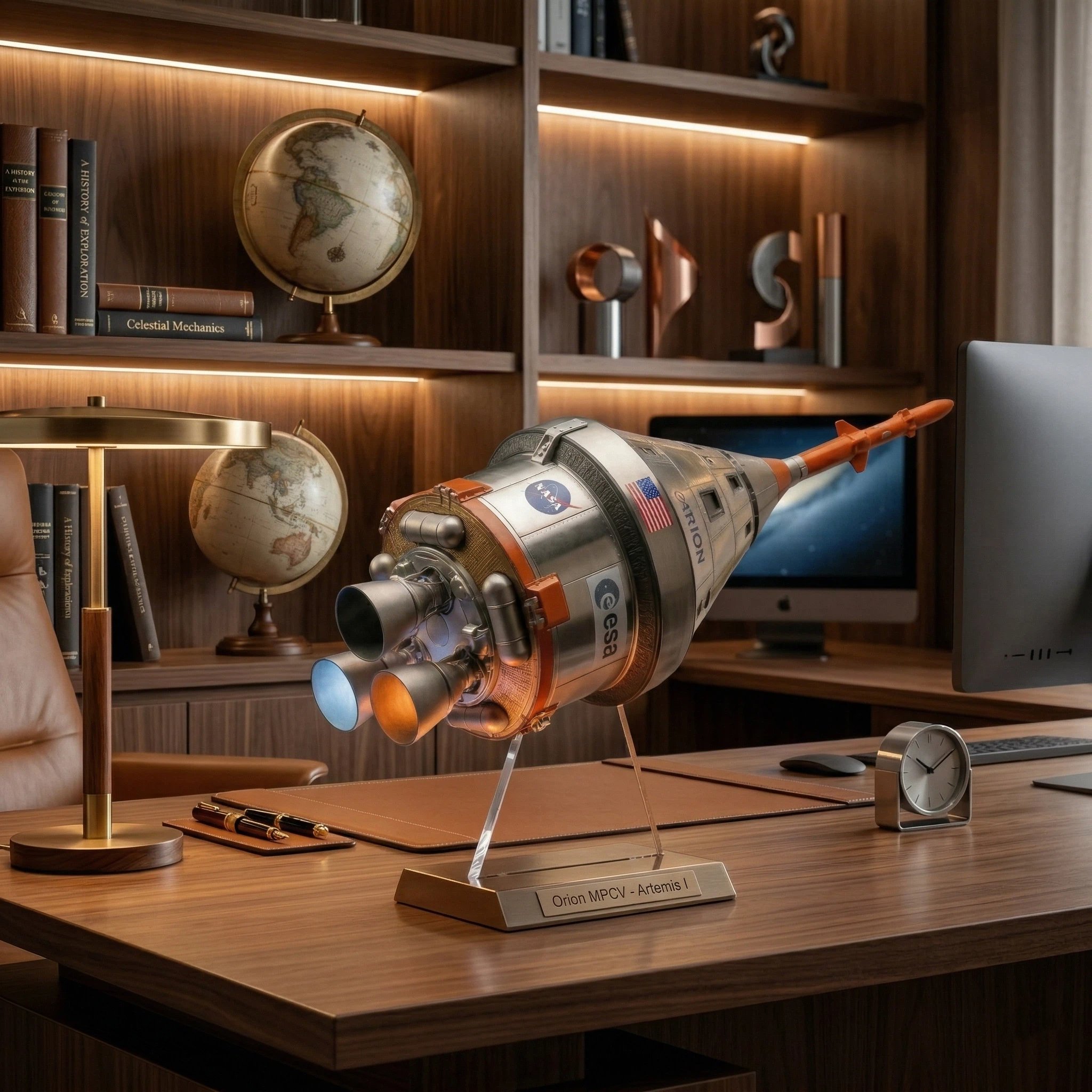 🥰The spacecraft is mounted on a premium crystal-clear acrylic base with a built-in “breathe-light” system that emits a soft, glowing light from below, simulating the glow of re-entry or propulsion. A matching informational plaque identifies it as the Orion MPCV – Titanium & Aluminum Precision Model featuring Propulsion & Breathe-Light Base.