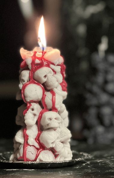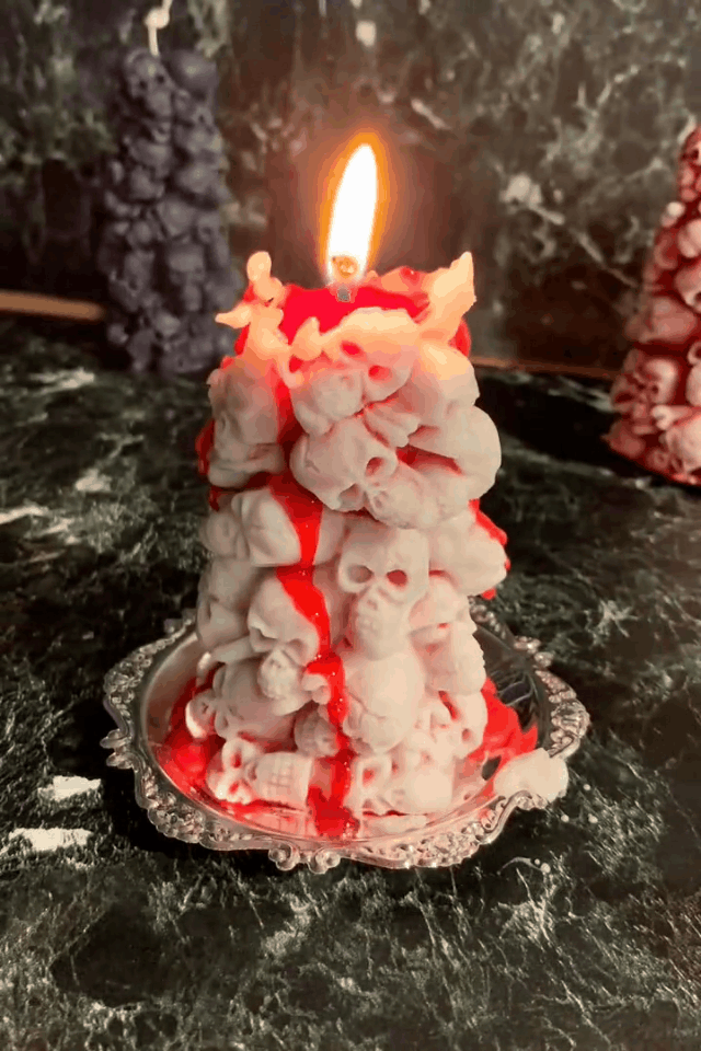 Whether it's the center of attention at a Halloween party or a touch of darkness in your home, this candle instantly enhances the ambiance of your space. As the candle slowly burns, the pile of skulls gradually disintegrates, oozing bright red blood so realistically.