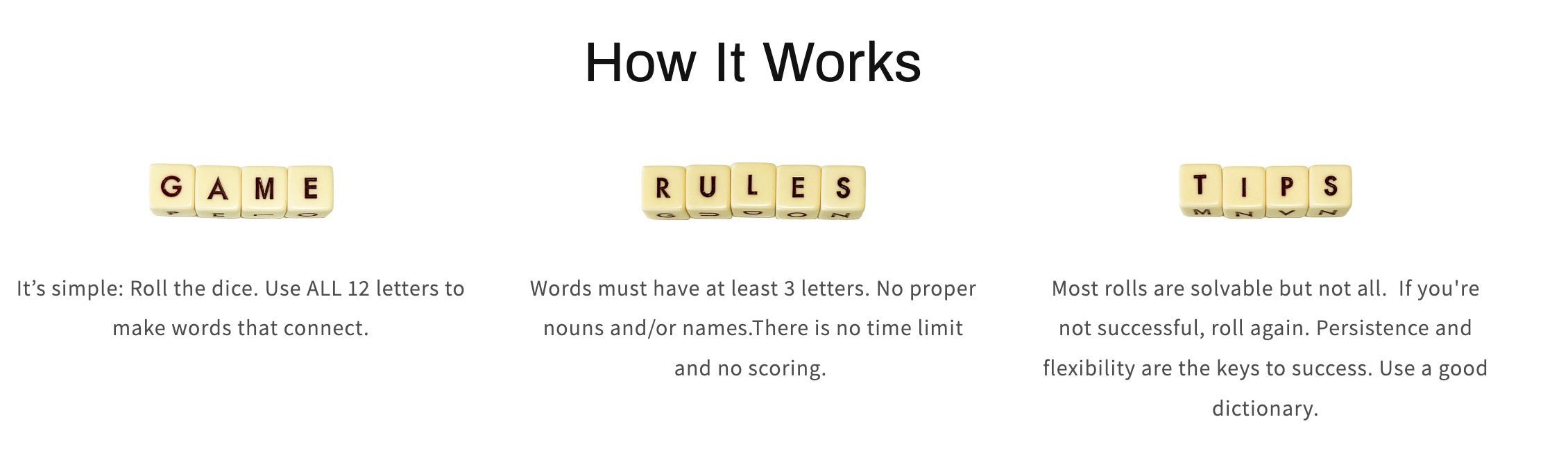 How It Works. It’s simple: Roll the dice. Use ALL 12 letters to make words that connect.