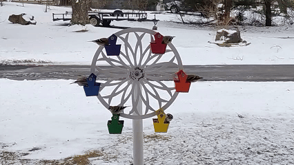 Mount on a Deck! : Merge nature's beauty with the whimsical design of the Whirly Wheel Feeder by mounting it on a sturdy tree trunk. Observe as birds gracefully flutter among the branches, drawn to the mesmerizing motion of the feeder.