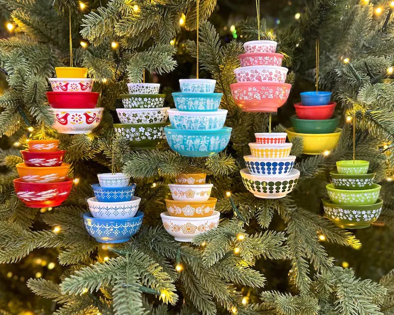 - Classic Design: This ornament is inspired by the iconic vintage mixing bowls, featuring timeless patterns and colors that have been a kitchen staple for generations.